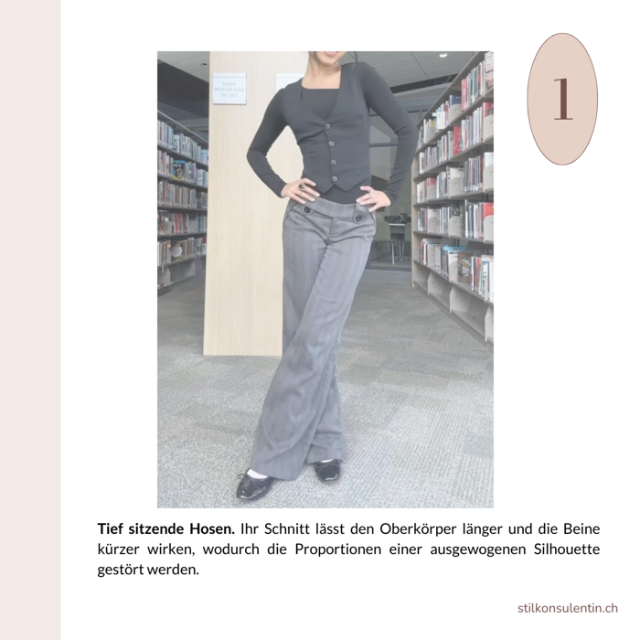 Hosen mit tiefem Bund erzeugen unvorteilhafte Proportionen, da die tiefsitzende Taille den Oberkörper unnötig verlängert und die Beine dadurch optisch verkürzt.