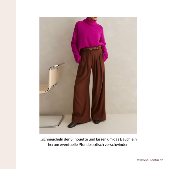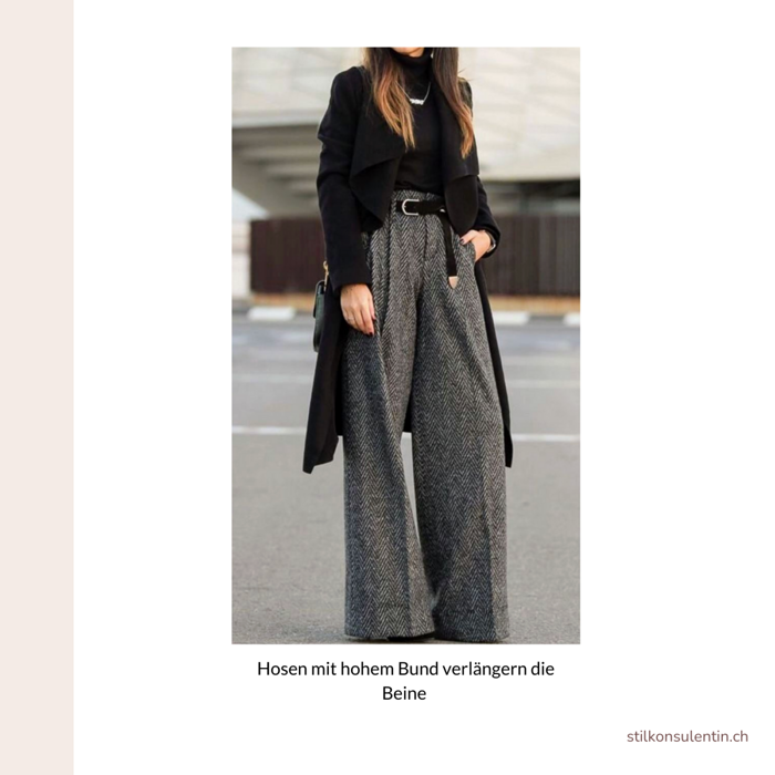 - Hochgeschnittene Hosen betonen die natürliche Taille und bringen Ober- und Unterkörper ins Gleichgewicht.
