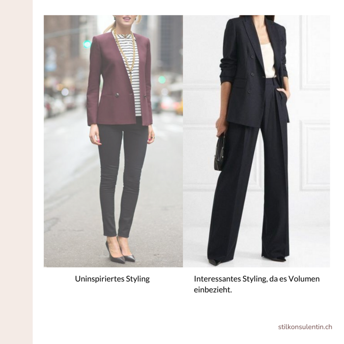 Spielen Sie stattdessen mit Volumen, um Ihrem Look mehr Ausdruck und Stil zu verleihen. Kombinieren Sie enge Hosen mit einem oversized Blazer oder einer locker sitzenden Bluse, die über die Hüften fällt. Die umgekehrte Volumenverteilung – weit unten, eng oben – ist einfacher zu stylen, bietet mehr Vielseitigkeit und entspricht der zeitgemäßen Mode.