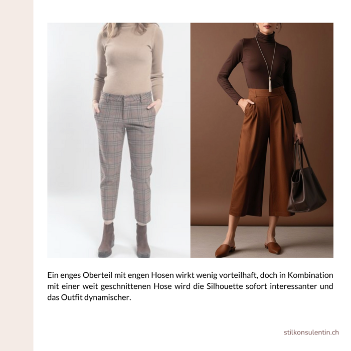 Wenn Sie Skinny Jeans und enge Hosen bevorzugen, kombinieren Sie diese mit einem oversized Blazer, einer langen Bluse oder einem weiten Pullover. Bei weiten Hosen können Sie hingegen mit verschiedenen Oberteilen experimentieren – ob lang oder kurz, in die Hose gesteckt oder geschichtet, weit oder eng.