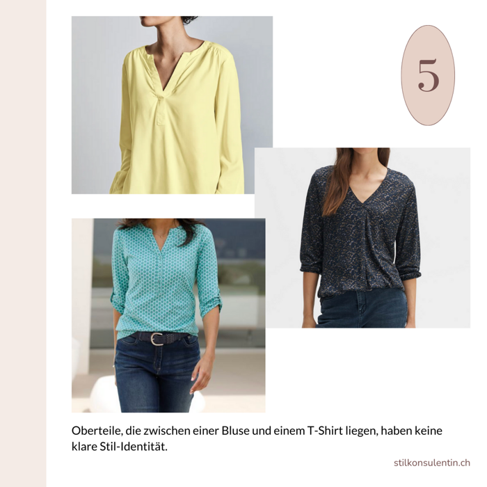 Tops, die Elemente sowohl von Blusen als auch von T-Shirts vereinen, mischen zwei unterschiedliche Stil-DNA und haben keine klare Identität. Diese Oberteile sind sehr schwierig zu stylen und führen daher oft zu uninspirierten und unvorteilhaften Outfits.