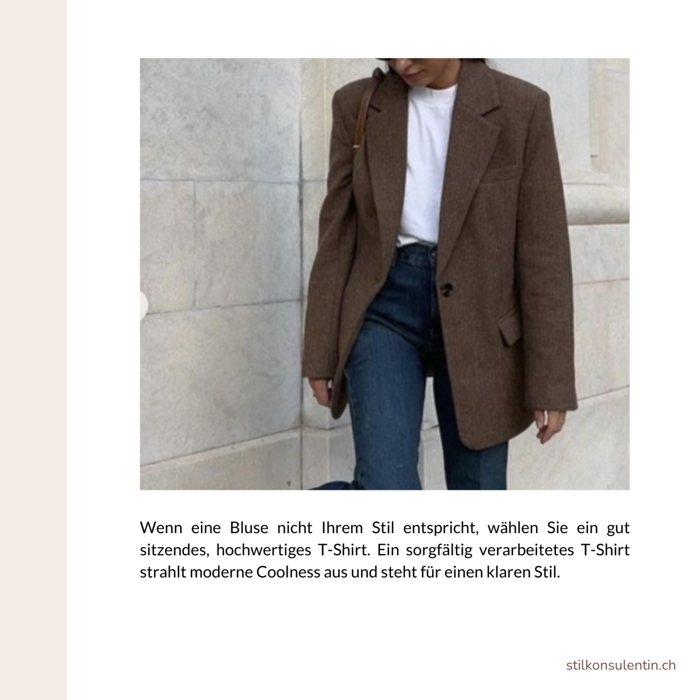Ein weisses Hemd wird im Allgemeinen als formell und elegant wahrgenommen, während T-Shirts eine eher minimalistische Ästhetik verkörpern. Wenn ein Top nicht eindeutig zu einer der beiden Kategorien gehört, wird es schwierig, es für einen bestimmten Anlass zu stylen, und das Outfit bleibt unklar und ausdruckslos.