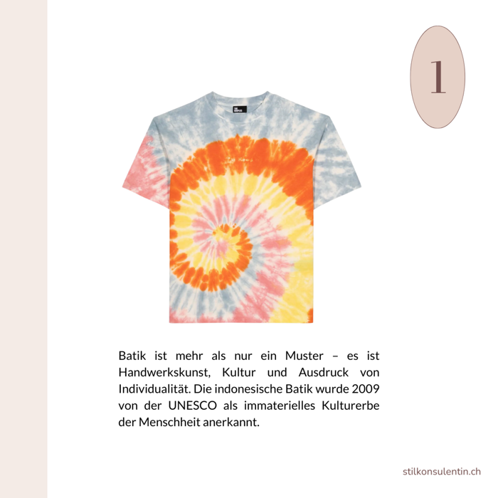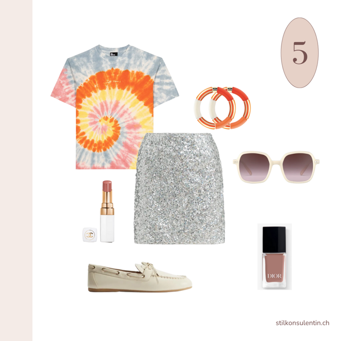 Mix & Match ist der Schlüssel zu einem coolen Look, mit dem du Persönlichkeit und Invidiualität zeigst! Kombiniere ein lässiges Batik-T-Shirt – easy, ethnisch, handgemacht – mit einem glitzernden Pailletten-Jupe. Zwei Welten, die eigentlich nichts miteinander zu tun haben, treffen sich zu einem Look, der überrascht und begeistert. Batik steht für entspannte Boho-Vibes, Pailletten für Disco-Feeling und Glam.
