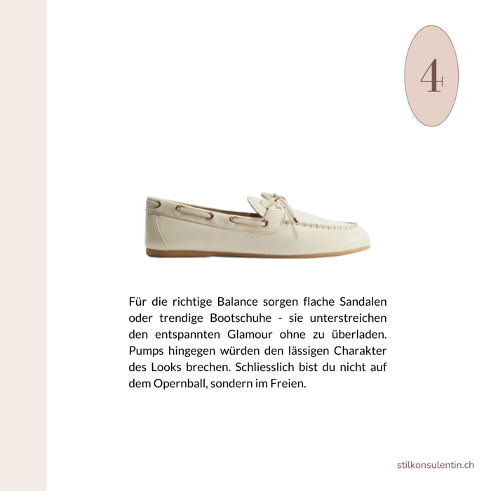 Dazu passen flache Sandalen, trendige Bootsschuhe oder sogar barfuss – perfekt, wenn die Einladung zum „Sundowner-Apéro auf einer Yacht“ lautet. Ein cooler Zopf oder Beach Waves runden das Ganze ab, und schon hast du dein „mal anders“ Party-Outfit. Ungezwungen, individuell und ideal für stylishe Sommernächte!