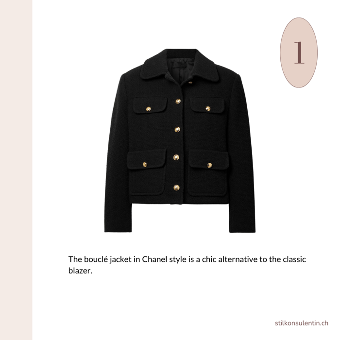 Chanel bouclé jackets are a stylish alternative to the classic blazer. They provide a more feminine touch, and their structured silhouette flatters various body types, making them versatile for both business and leisure occasions.