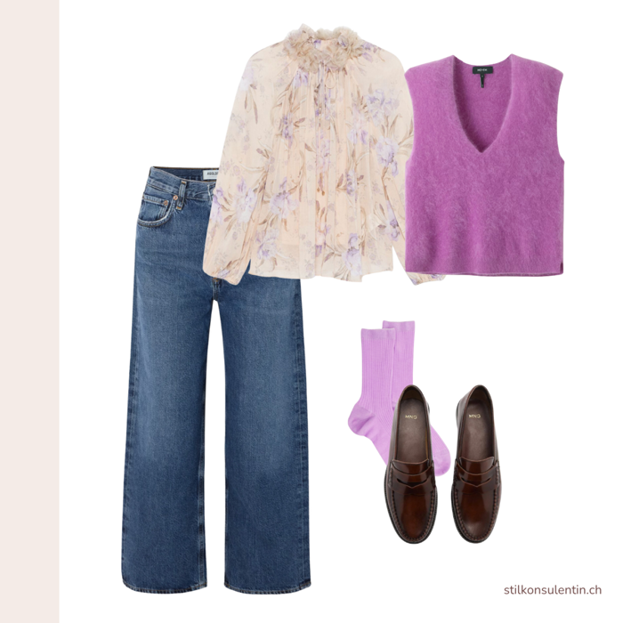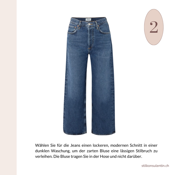 Feminine Blusen mit Broderie-Anglaise, Rüschen, Spitze oder floralen Prints erleben ein grosses Comeback und werden 2025 ein wichtiger Trend bleiben. Um ihre festliche und romantische Ausstrahlung auszubalancieren, kombinieren Sie sie mit Jeans – ein Mix, der die Zartheit der Bluse mit der robusten Workwear-Ästhetik von Denim stilvoll verbindet.
