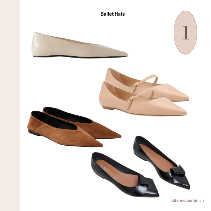 Flache Schuhe haben in den letzten Jahren extrem an Beliebtheit gewonnen, und Ballerinas haben sich inzwischen zu eleganteren Designs weiterentwickelt. Designer setzen verstärkt auf schlichte, spitz zulaufende Modelle, die raffinierter wirken als ihre rundkappigen Vorgänger. Ihre Vielseitigkeit macht sie besonders attraktiv – sie sind edel genug für den Abend und passen mühelos zu allem, von Jeans über Minikleider bis hin zu weiten Hosen, wodurch sie jedem Look eine gehobene Note verleihen. Nach Saisons mit runden Schuhkappen bringt dieser Wandel eine erfrischend elegante Abwechslung.