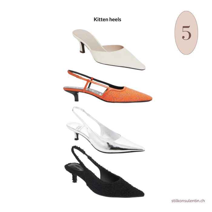Die bequeme Alternative zu High Heels und Pumps sind Kitten Heels. Wer eine zeitlose Garderobe anstrebt, setzt am besten auf ein schlichtes Modell – ob mit offener oder geschlossener Ferse. Das Beste an Kitten Heels? Sie verleihen jedem Outfit sofort mehr Eleganz und strecken die Silhouette, ohne den Komfort zu beeinträchtigen.