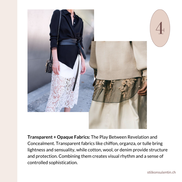 Textiles shape our look through qualities such as texture, color, and craftsmanship. Their special effect lies in how they reflect light and create contrast. Whether matte or shiny, soft or coarse – a fabric’s surface determines how light is absorbed or reflected. Shiny materials convey elegance and lightness, while matte ones feel warm and grounded.