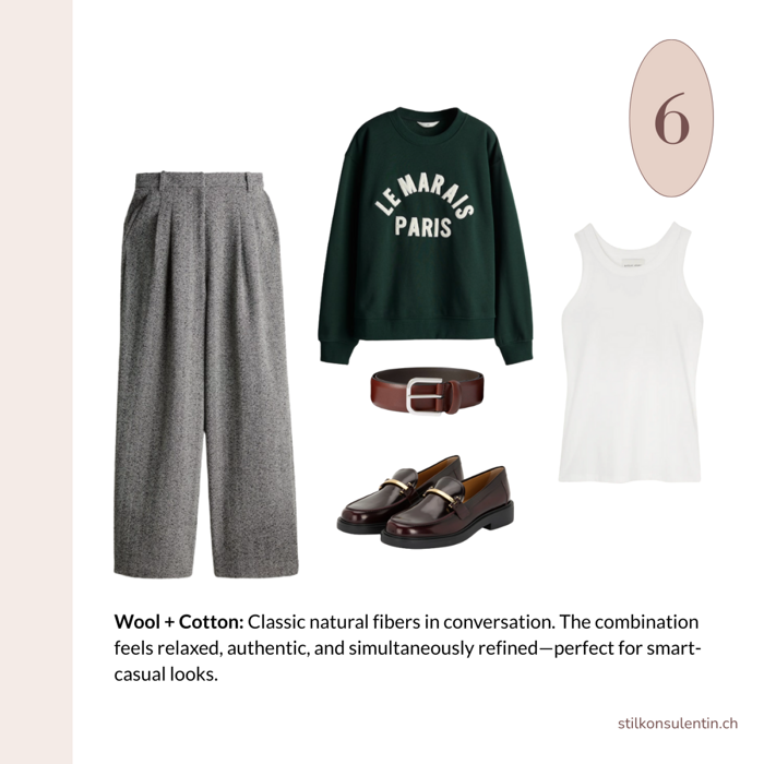 An outfit made entirely from a single material – for example, chinos, a long-sleeved shirt, and a cardigan, all in cotton – often looks flat, monotonous, and uninspired.