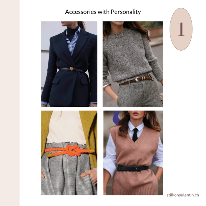 Accessories such as belts, jewelry, brooches, scarves, socks, and tights are the subtlest yet highly effective way to give an outfit personality. They bridge different styles, add thoughtful touches, and give looks a subtle or slightly bolder twist – all without having to change the entire outfit.