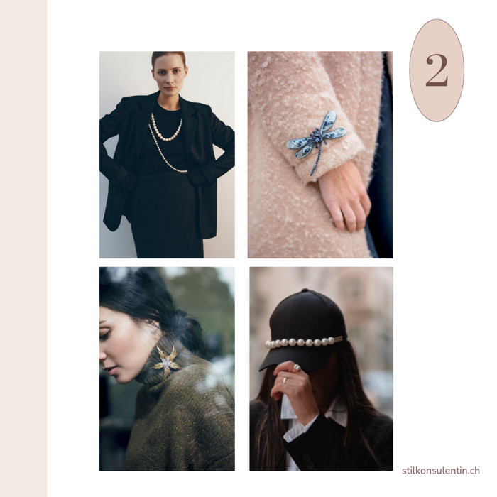 - Jewelry and brooches can be used in surprising ways to give your outfit an original, personal signature. Far beyond the neck, wrist, or coat collar, they open up countless creative possibilities.