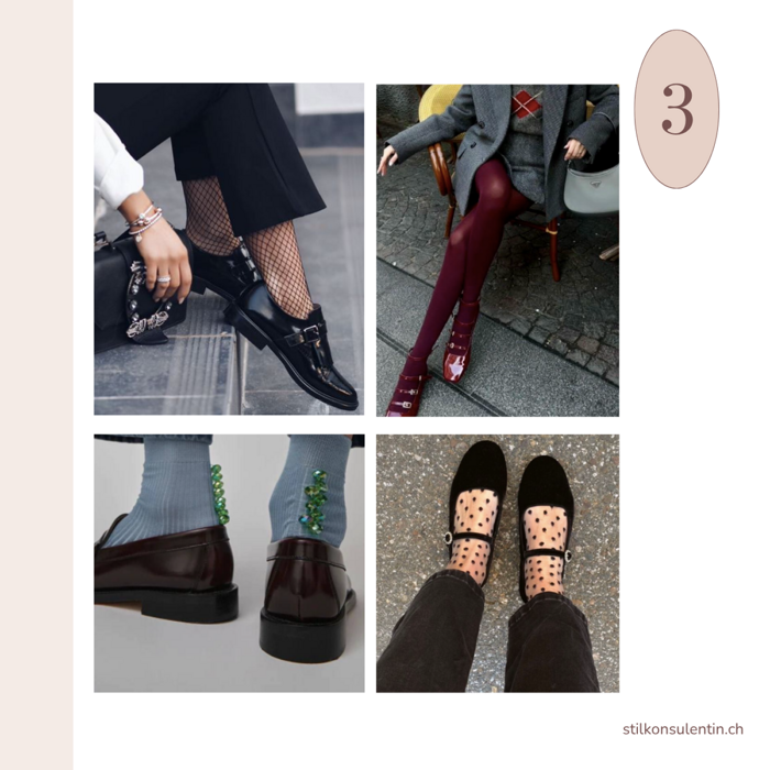 - Don’t be afraid to try colored socks or patterned tights with mesh or small dots. Paired with trendy loafers or Mary Janes, these little details can be wonderfully playful. Ideal for anyone who wants to add a creative touch to their outfit.