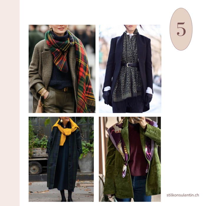- Scarves (e.g., wool or cashmere) are an easy way to add texture and color to an outfit. Worn loosely around the neck, elegantly draped, or creatively tied, a scarf instantly adds warmth and depth. They also allow playful experimentation with patterns and materials. Tip: A sweater can even double as a scarf.