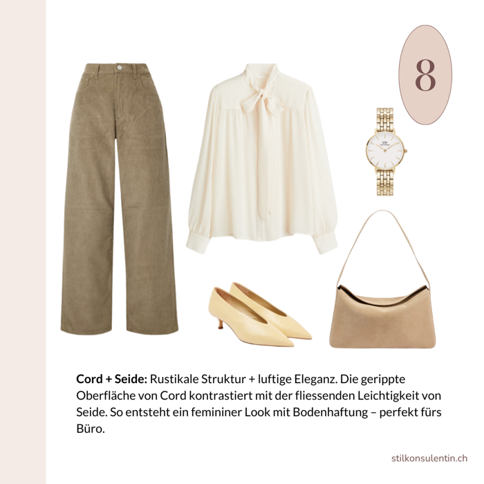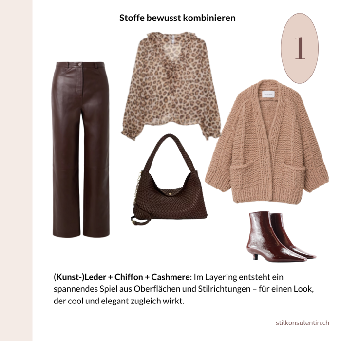 Ein weiteres Stilmittel, um deinem Outfit deutlich mehr Charakter zu verleihen, ist das bewusste Spiel mit Stoffen. Sobald du verschiedene Texturen kombinierst, kannst du dein Styling stark aufwerten.