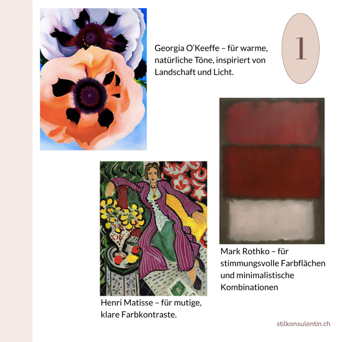 Farben können ein Outfit verändern: Schöne Farbkombinationen verleihen selbst schlichten Looks im Handumdrehen mehr Ausdruck. Schon eine Jeans mit einem simplen Pullover in einer zu deinem Farbtyp passenden Nuance wirkt stark und wertet so das gesamte Outfit auf. Inspiration aus der Kunst holen: Wenn es an Ideen für Farbkombis mangelt, lohnt sich ein Blick in die Kunst – Künstler*innen haben seit Jahrhunderten ein untrügliches Gespür für Balance, Spannung und Harmonie.