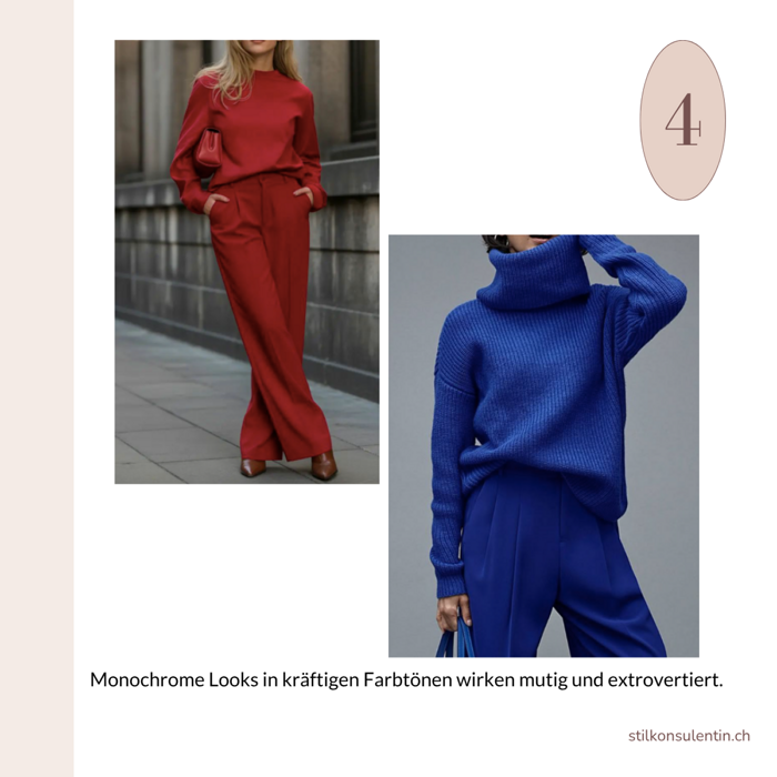 Monochrom in kräftigen Farbtönen vermittelt Dominanz und Mut – ideal für Menschen mit starker Präsenz, die gerne auffallen.