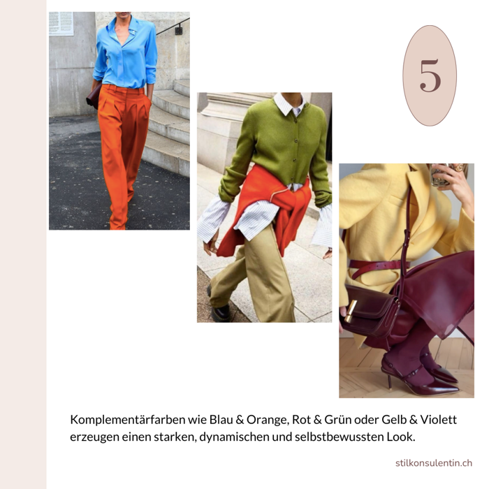 Komplementärfarben wie Blau & Orange, Rot & Grün oder Gelb & Violett erzeugen einen starken, dynamischen Look.