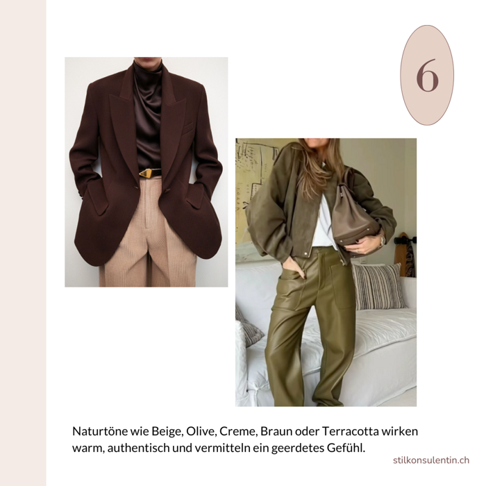Naturtöne wie Beige, Olive, Creme, Braun oder Terracotta wirken warm, authentisch und vermitteln ein geerdetes Gefühl.