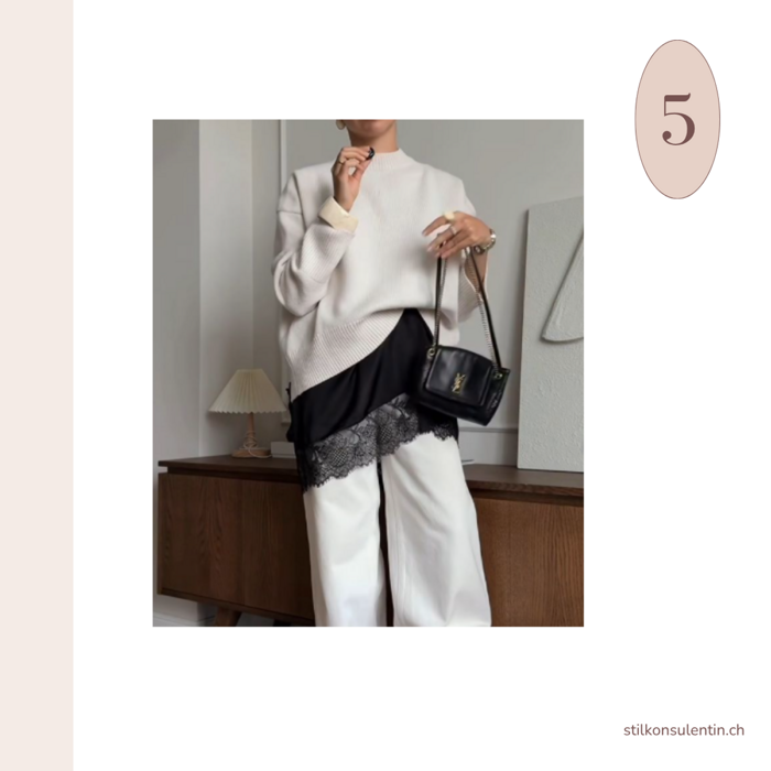 So kannst du deine Outfits immer wieder neu interpretieren – und mit Kontrasten spielen, die den Look lebendig machen: leicht & schwer, glänzend & matt, eng & weit.