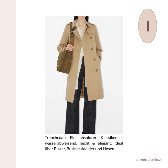 Ein gut geschnittener Trenchcoat ist ein Must-have. Er ist wasserabweisend, leicht und passt perfekt über Blazer oder Businesskleider. Besonders vorteilhaft ist ein leicht taillierter Schnitt mit Gürtel, der eine schöne Silhouette zaubert. Farben wie Beige, Navy oder Schwarz sind vielseitig kombinierbar und wirken stets professionell.