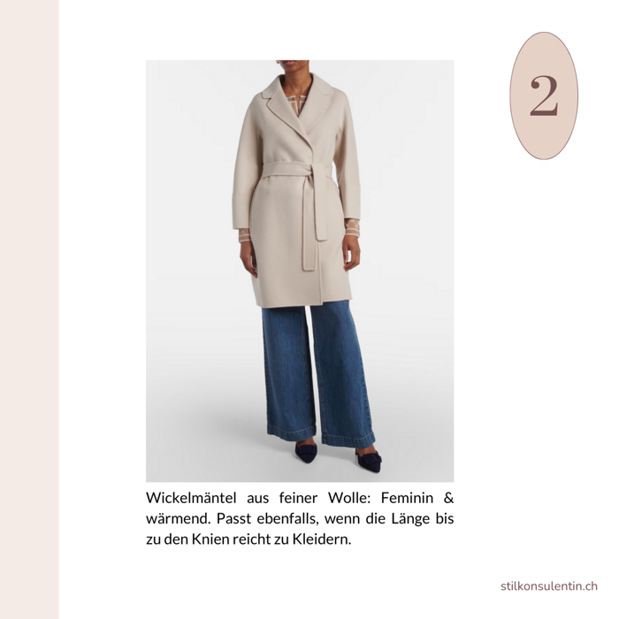 Ein leichter Wickelmantel aus Wolle bringt feminine Eleganz in graue Regentage. Kombiniert mit Midikleidern oder schmalen Stoffhosen ist er ideal für formelle Termine – und hält dabei angenehm warm.