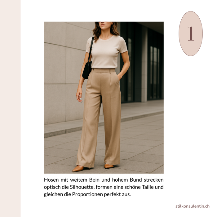 Hosen und Röcke mit hohem Bund verlängern optisch die Beine und lassen die Figur insgesamt gestreckter erscheinen.