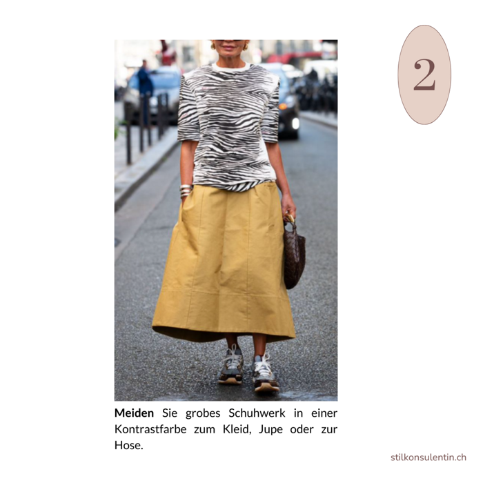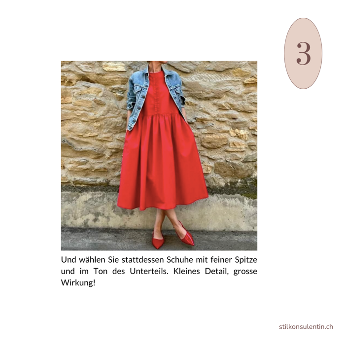 Wählen Sie Schuhe im Farbton Ihrer Hose oder Ihres Rocks – so wird Ihre Silhouette visuell nicht unterbrochen - das streckt das Bein und lässt Sie automatisch grösser und schlanker erscheinen.