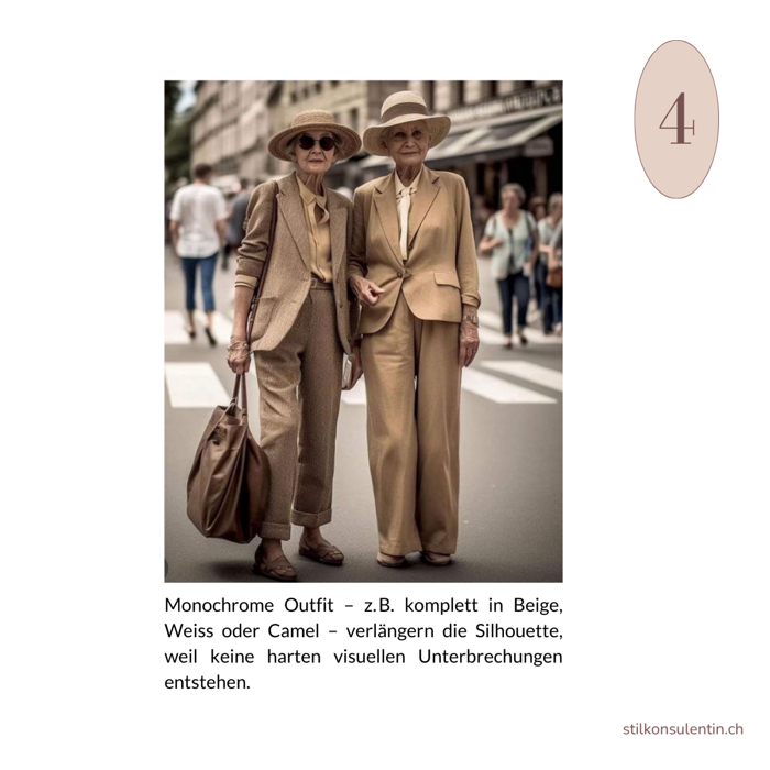 Ein Outfit in einem durchgehenden Farbton – oder verschiedenen Nuancen derselben Farbe – schafft eine optische Einheit. Das streckt den Körper, unterbricht die Silhouette nicht und wirkt besonders stilvoll.