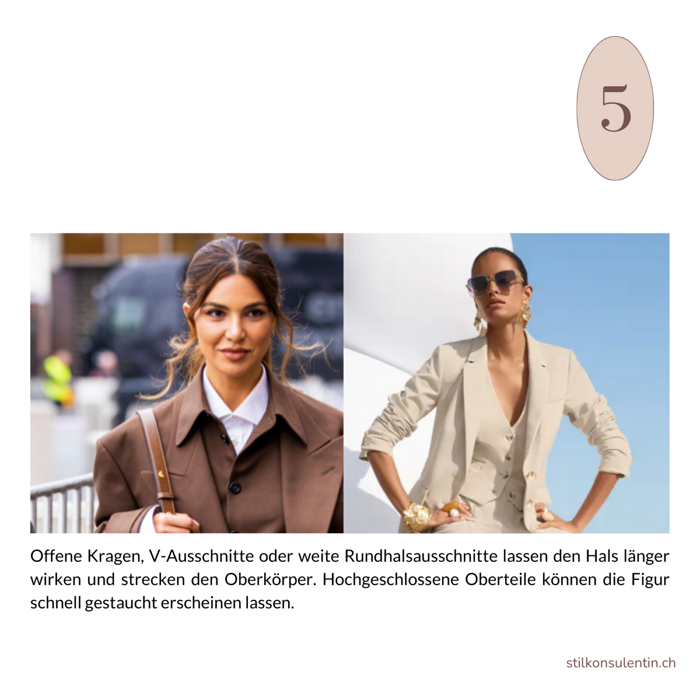 Ein V-Ausschnitt oder ein weiter Rundhalsausschnitt strecken optisch den Oberkörper und lassen den Hals länger wirken. Verzichten Sie dagegen auf Rollkragen oder hochgeschlossene Oberteile – sie können schnell gedrungen wirken lassen.