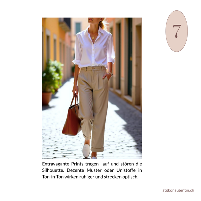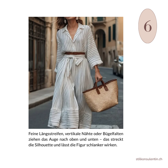 Grosse Prints, breite Gürtel oder Querstreifen unterbrechen die vertikale Linie und tragen optisch auf. Besser: Feine Muster oder schmale Längsstreifen – sie strecken die Silhouette und lassen Sie schlanker wirken.