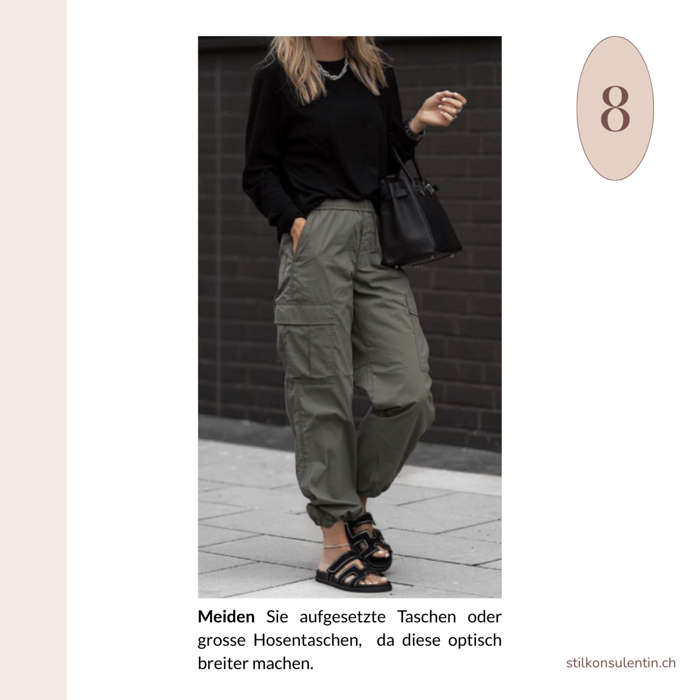 Grosse, aufgesetzte Taschen an Hosen oder Röcken tragen optisch auf – besonders an Hüfte und Po. Besser: kleine, unauffällig eingenähte Taschen für eine schlankere Silhouette.