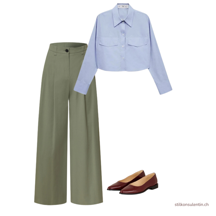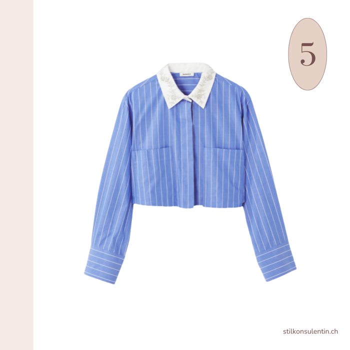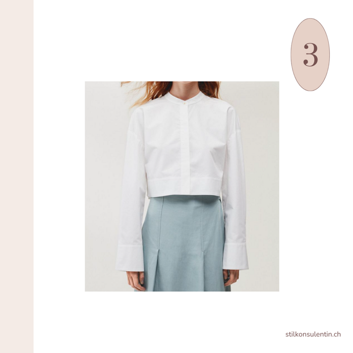 Avoid pairing the cropped shirt with skinny pants, as you won’t achieve a balanced look. The cropped silhouette works best with volume in the lower part of the body. For a more relaxed, off-duty style, it also pairs well with wider shorts.