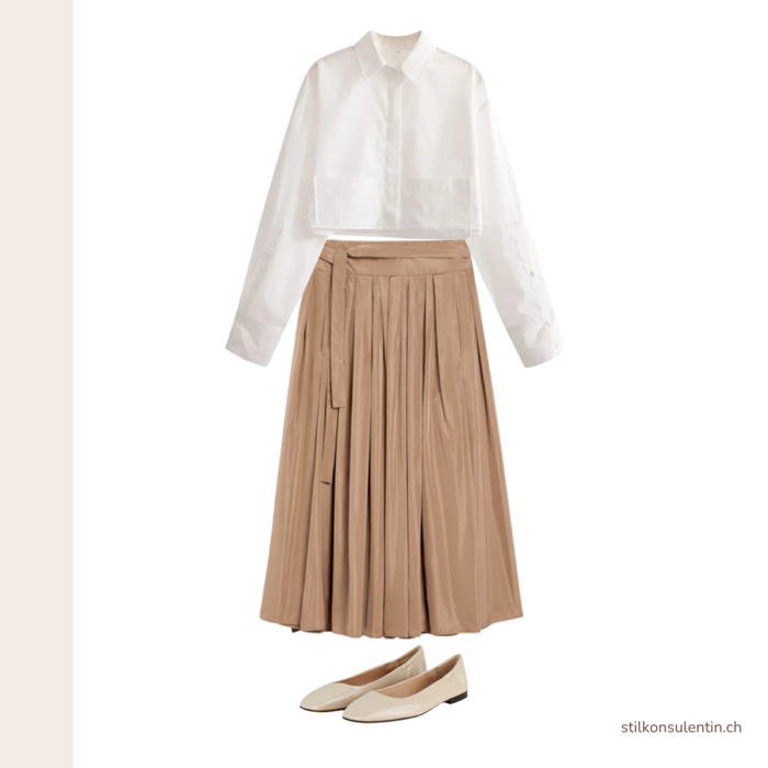 It pairs beautifully with wide-leg, high-rise trousers and also works well with wider midi skirts, ensuring a balanced look.