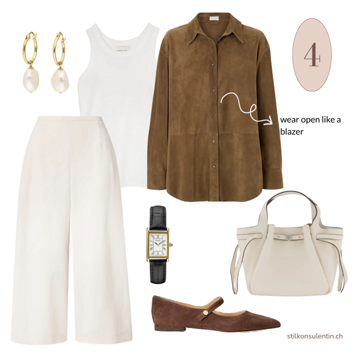 Incorporating brown doesn’t require a wardrobe overhaul. Think of brown as an additional basic color for your wardrobe — just like black, navy, or beige. It pairs beautifully with neutrals, bold or pastel tones alike, making it a timeless and flexible foundation for countless looks. Use it accordingly: layer it, build on it, and let it ground your outfits with warmth and elegance. Try a suede jacket in cinnamon, a fine knit in mocha mouse or trousers in chocolate brown.