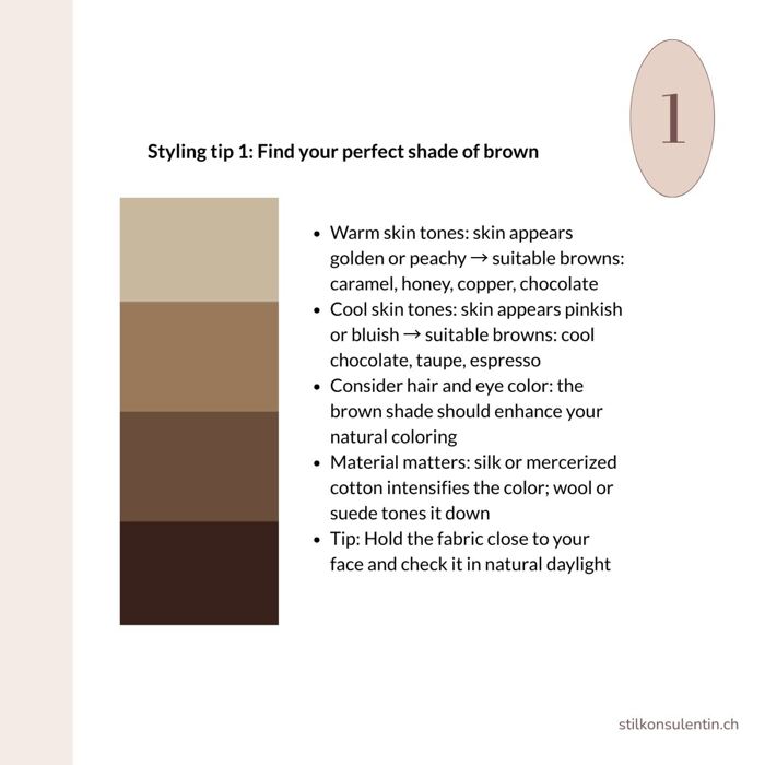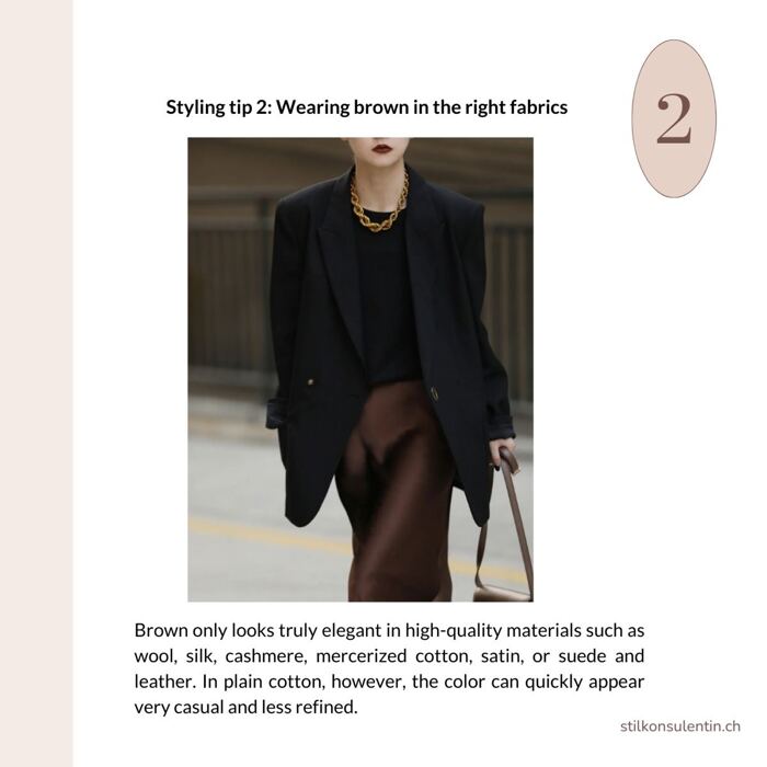 Styling tip 2: Brown only looks truly elegant in high-quality materials like wool, silk, cashmere, corduroy, mercerized cotton, or (suede) leather. In plain cotton, the color can appear too casual and less sophisticated.
