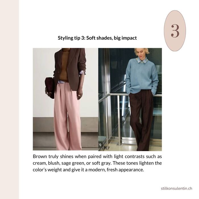 Styling tip 3: Brown really comes to life when paired with lighter contrasts like off-white, powder pink, sage green, or soft gray. This lightens the heaviness of brown and gives it a fresh, modern feel.