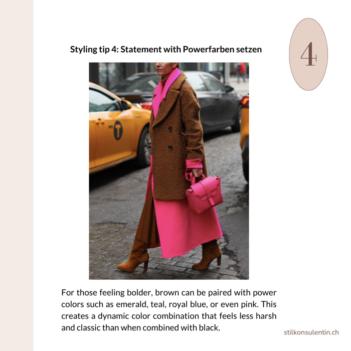 Styling tip 4: For those who like a bold look, brown can be combined with strong accent colors like emerald green, teal, royal blue, or pink. The charm lies in the fact that these vibrant colors appear more muted and elegant next to brown than with black—they retain their intensity but look stylishly understated.