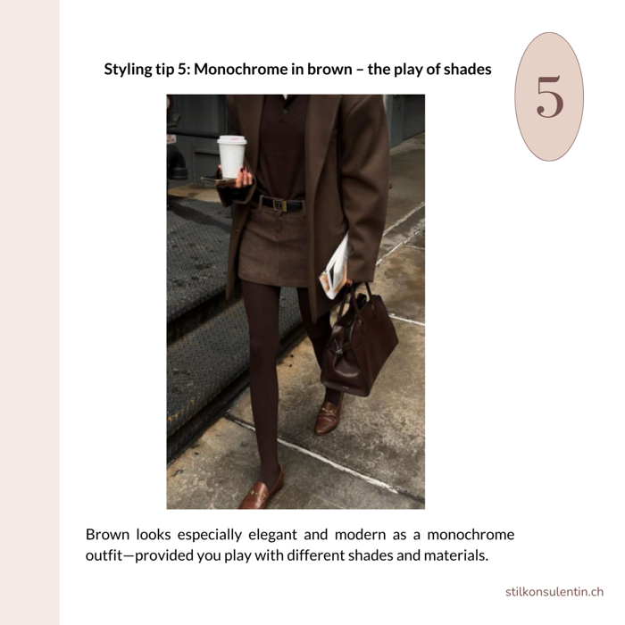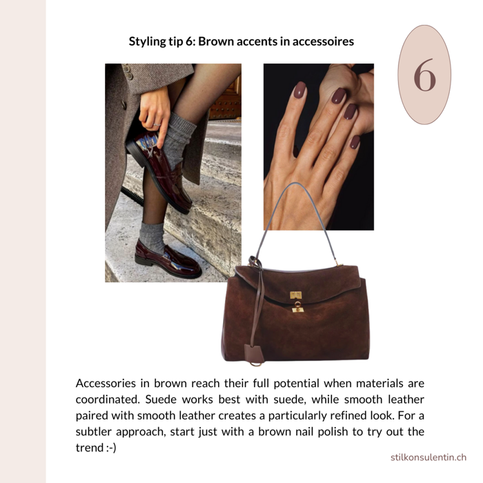 Styling tip 6: Brown accessories, such as shoes and handbags, make the strongest impact when materials and textures harmonize. Suede paired with suede gives a relaxed, casual vibe, while smooth leather doubles create a clean, polished look. Even a deep brown nail polish can make a subtle but stylish statement.