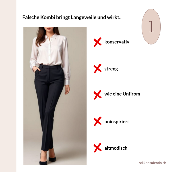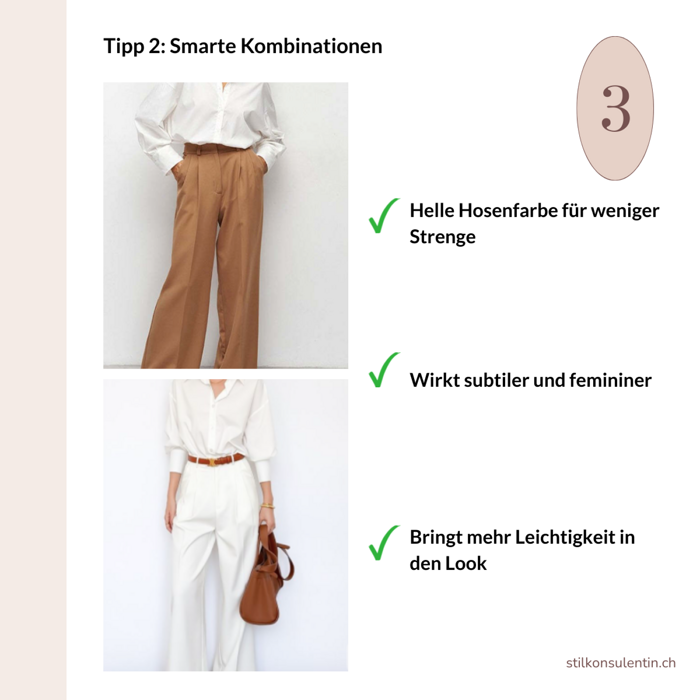 Raffinierte Farbkombis: Setze auf hellere Hosenfarben statt Schwarz oder Dunkelblau – so wirkt der Look weniger streng, femininer und frischer.