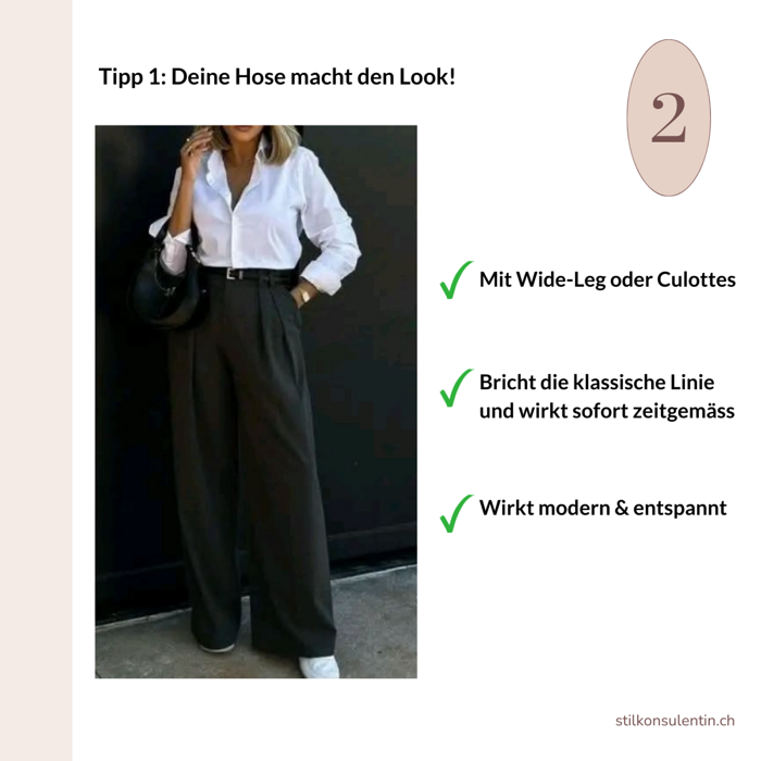 Moderne Kombis: Wähle Hosen oder Röcke mit zeitgemässen Schnitten wie Wide-Leg, Barrel, Culotte oder mit weiten Midi- und Maxijupes , um die klassische Silhouette aufzulockern.