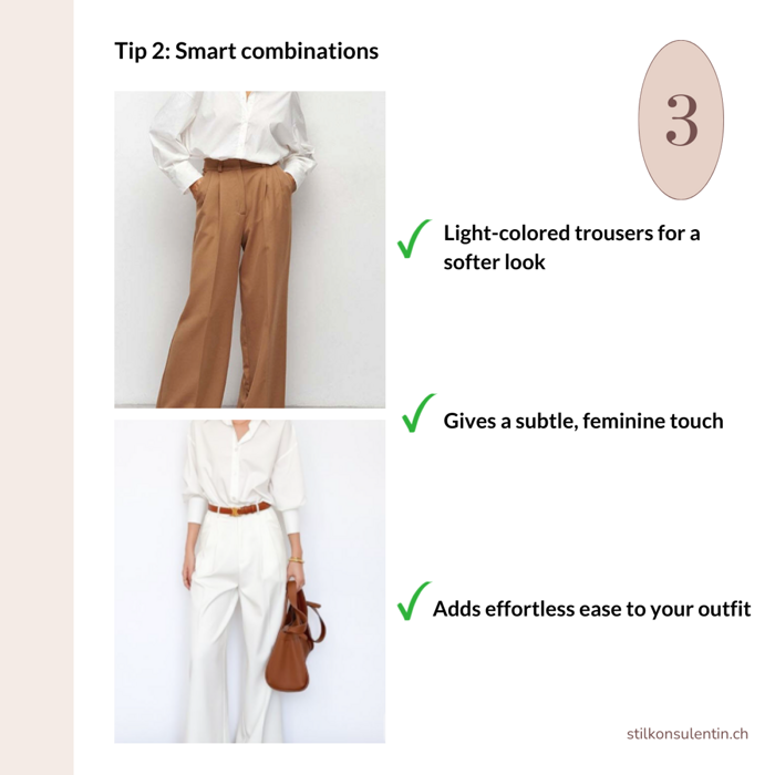 Clever color combos: Opt for lighter trousers instead of black or navy to soften the look, making it appear more feminine and subtle.